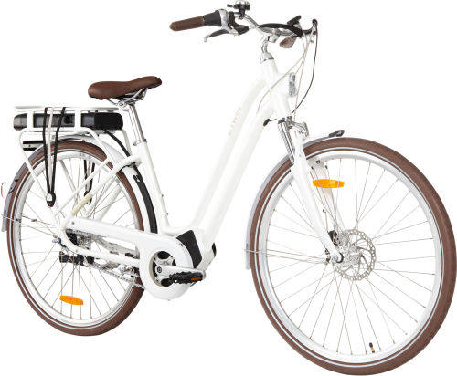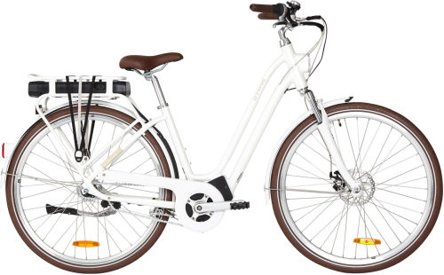 | Frame | "Easily mount your bike!For more comfortable commutes, we offer a city bike with a low step through aluminium frame.Why aluminium? As well as being lighter than steel, aluminium makes the frame stiffer: the drivetrain powered by the motor makes it more efficient.Size M is suitable for cyclists measuring 1.55m to 1.75m, size L is for cyclists measuring 1.75m to 1.95m." |
