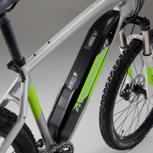 | Battery | Our Rockrider mountain bike team has designed a battery that locks in place with a simple lever. Child's play!This locking system prevents the battery vibrating when riding on rough terrain.There is also a lock in case you want to stop your battery getting stolen. For example, if you park your bike in the street. |
