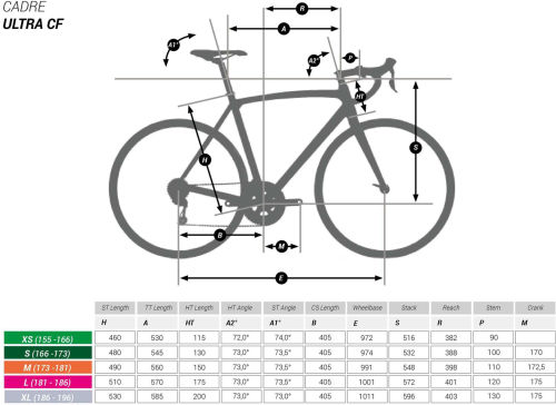 | Frame | The Van Rysel Ultra Evo Dynamic carbon fibre frame is the most advanced frame for tackling mountain climbs and winning the most demanding classic races. A blend of HM and IM carbon fibres offers the best weight to speed ratio on the market (850 g without accessories in size M). The frame was specially designed for the most demanding climbers and sprinters. The bottom bracket is a standard PressFit 86 for greater chassis stiffness. |